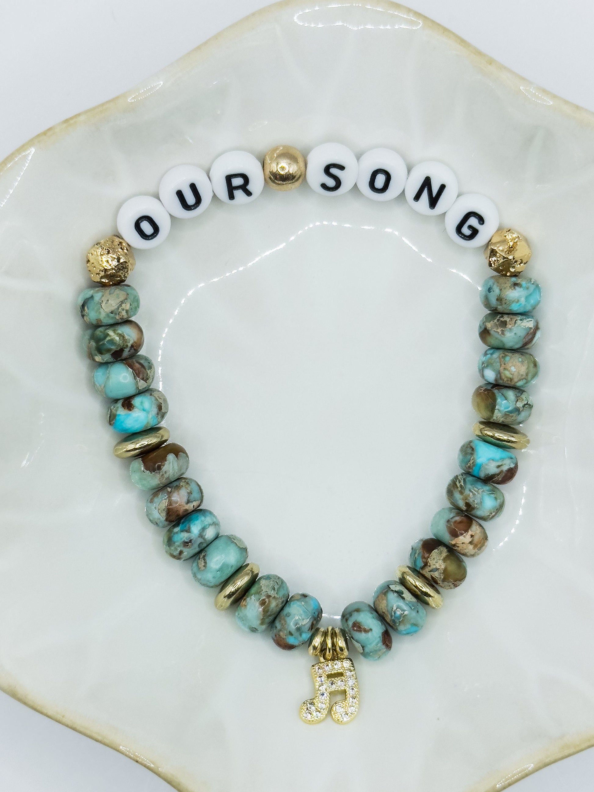 Serpentine Jasper Stone beads, gold plated beads, and letter beads on clear elastic string. Gold plated music note charm with crystals. Pre-stretched.
